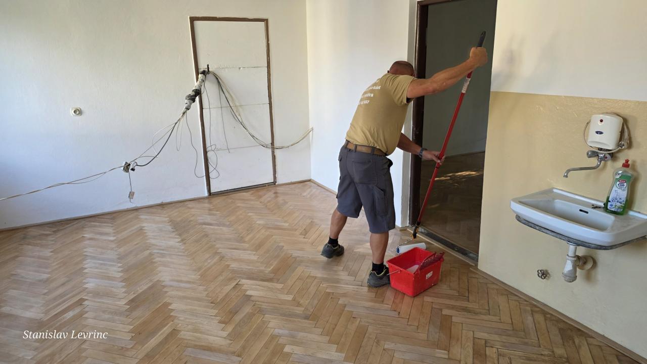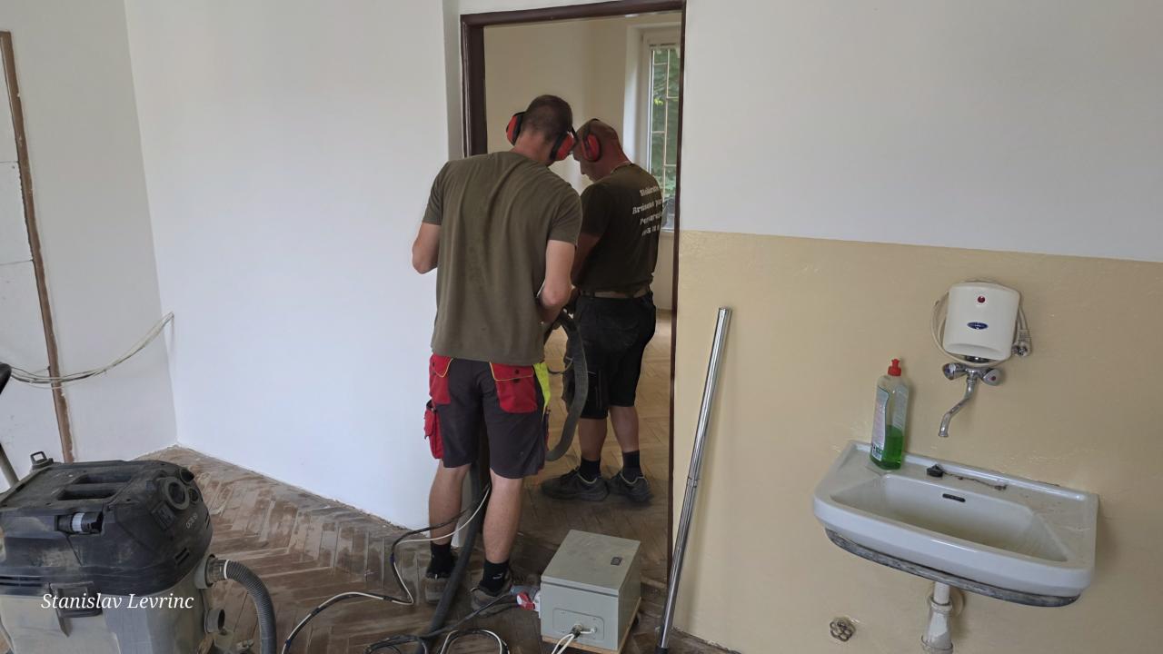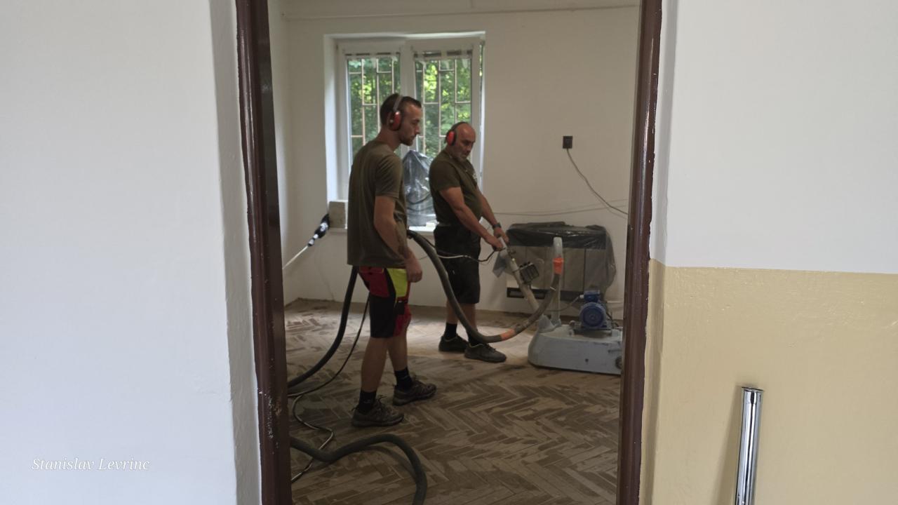 Od 5. septembra 2025 nadväzujú práce na podlahách – prebieha brúsenie, oprava a následné lakovanie parkiet v kanceláriách. Cieľom je nielen odstránenie následkov vytopenia, ale aj skvalitnenie pracovného prostredia na obecnom úrade.