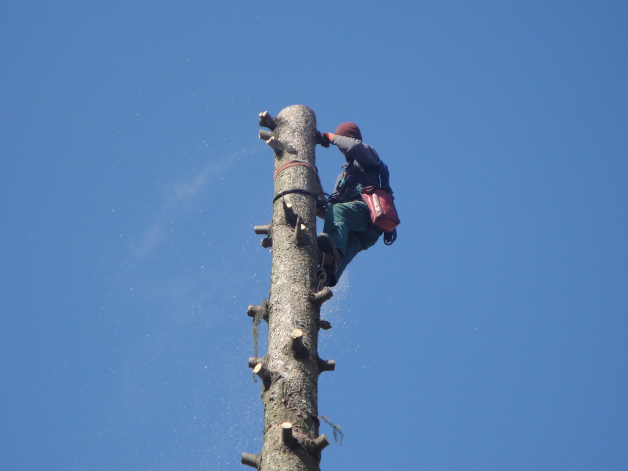 Fotografie z pílenia stromu – 1 ks smrek obyčajný (Picea abies) s obvodom kmeňa 215 cm meraným vo výške 130 cm nad zemou, vysoký 30 m, s firmou Daniel Gutan – ROPE, Chabenecká 9, 974 11 Banská Bystrica. IČO:40594891, DIČ: 1049486647, za cenu 150,-Eur na miestnom cintoríne v Rochovciach horolezeckou technikou / medzi hrobmi /, dňa 16.03.2012.